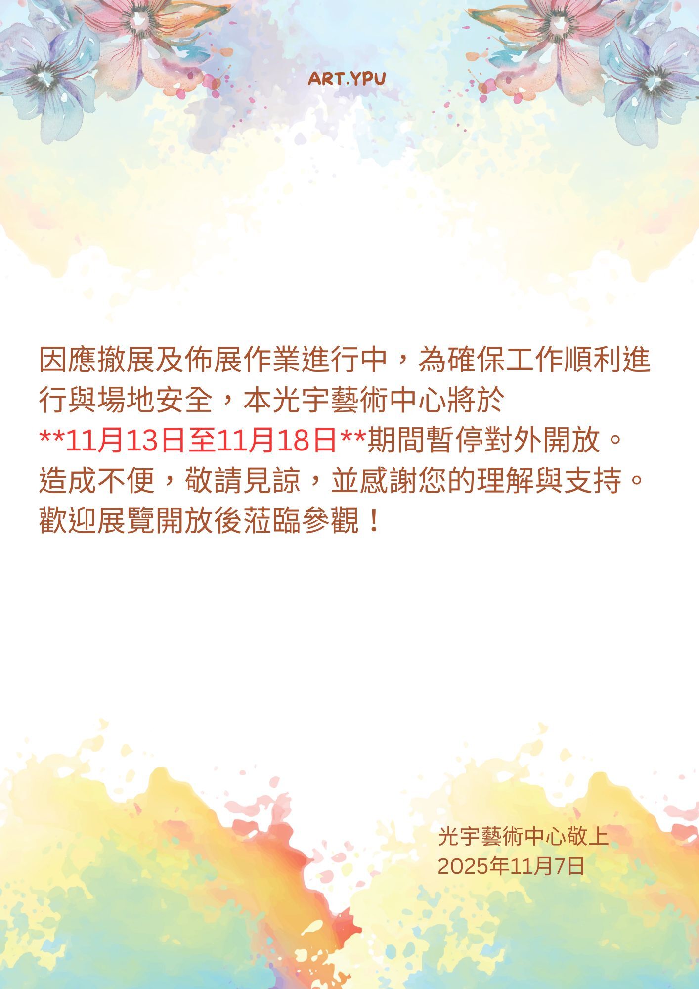 因應撤展及佈展作業進行中,為確保工作順利進行與場地安全,本光宇藝術中心將於